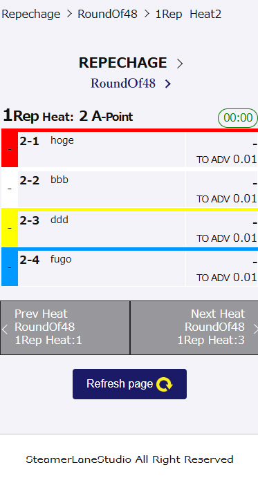 開始1分前からスタートカウントダウン開始、ヒート終了後のマスタージャッジ確認後の「Complete」認定=ボタンで「Complete」表示され、勝ち上がり者(リパチャージ制の場合全員)を次のラウンドへ自動配置。
